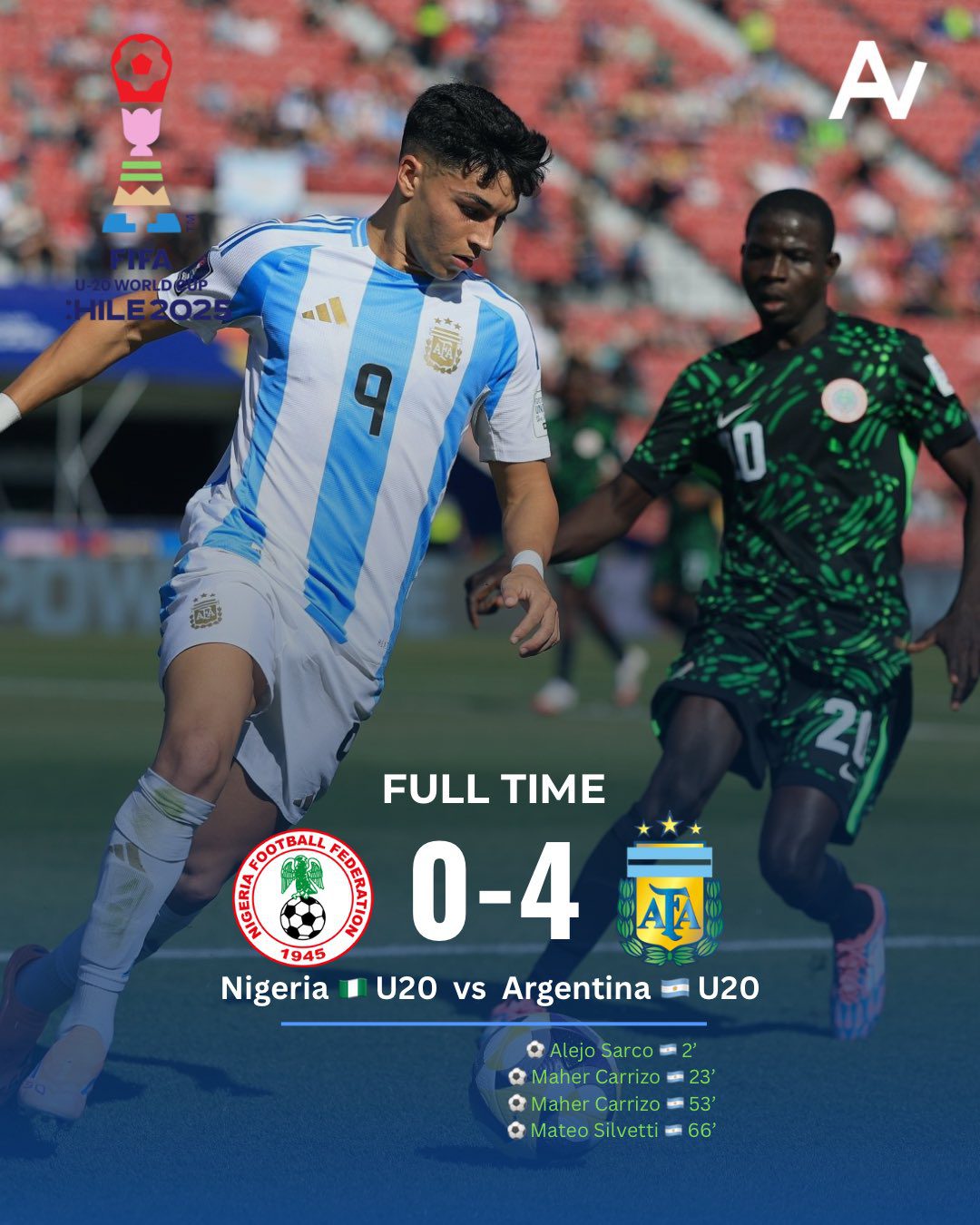 Nigeria showed brief moments of attacking intent after the break, with Tochukwu Nnadi and Ibrahim Muhammad posing some threat, but their efforts came to nothing. Carrizo struck again in the 53rd minute, exploiting a failed offside trap to slot home his second goal of the match.