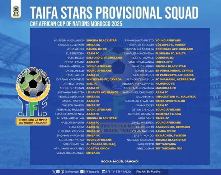 Miguel Gamondi unveiled Tanzania’s provisional squad for the 2025 Africa Cup of Nations in Morocco on Monday, setting the tone for a challenging campaign in Group C against Nigeria, Uganda and Tunisia.