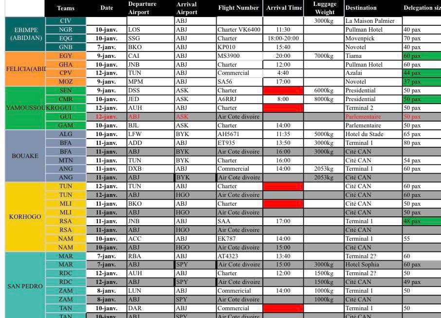 The African Football Confederation disclosed the arrival schedule for participating teams on its official website, while Ivorian media outlets have published the detailed arrival times for each team.