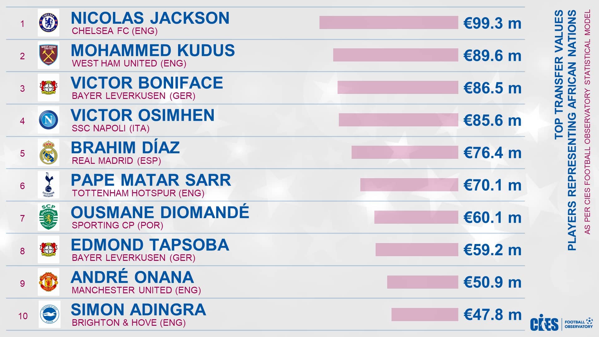 Nigeria and Bayer Leverkusen forward Victor Boniface completes the top three, valued at €86.5 million. This ranking is a testament to the growing influence of African footballers in the international arena.