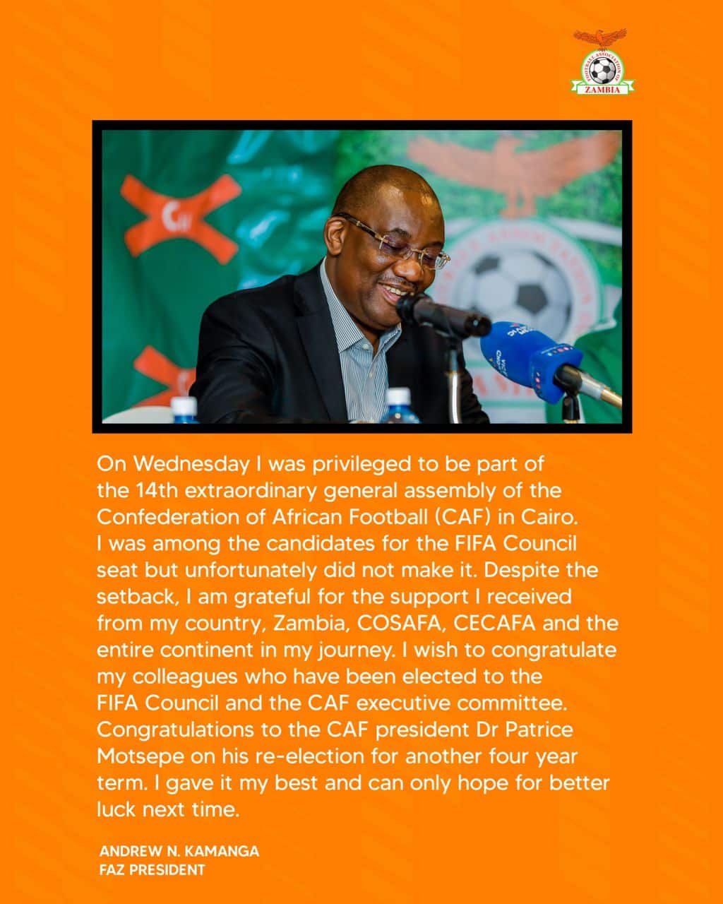 Andrew Ndanga Kamanga, Football Association of Zambia (FAZ) President, has demonstrated positivity and gratitude in defeat as he lost his spot on the FIFA Council.