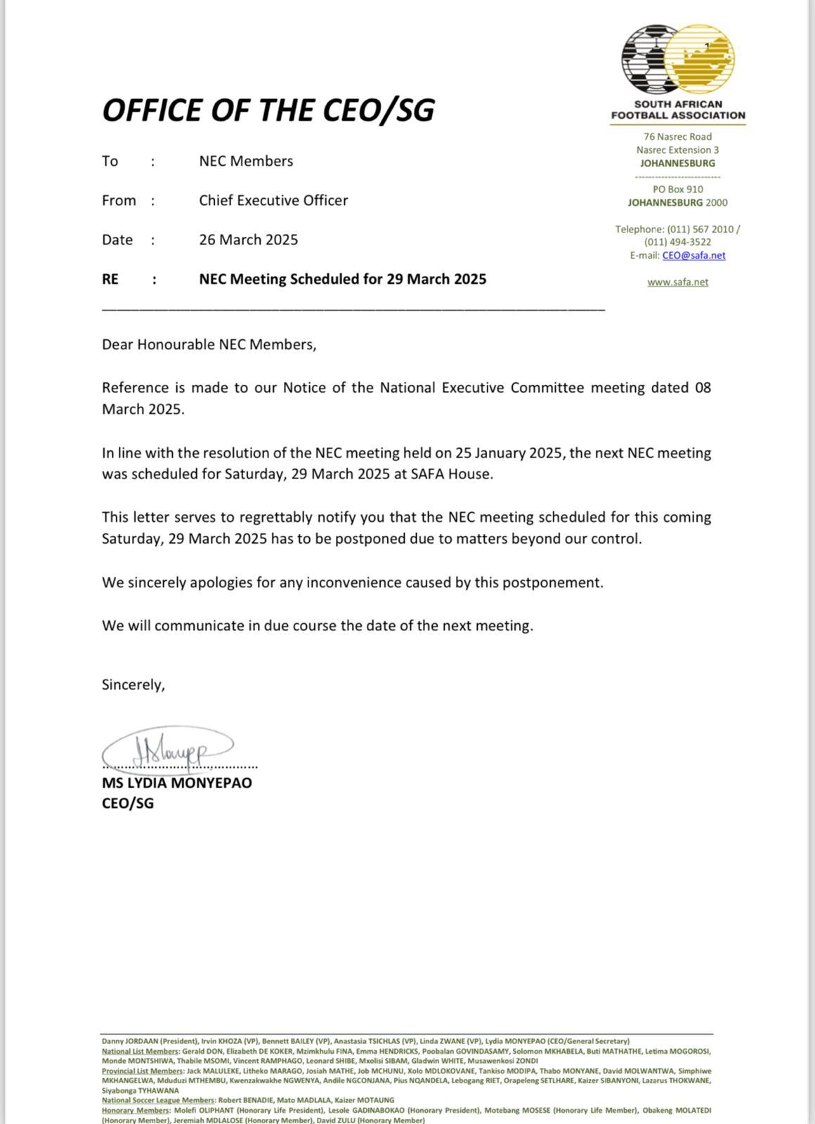 A SAFA internal message by CEO Lydia Monyepao made the postponement of the NEC meeting public, attributing it to “matters beyond our control.”