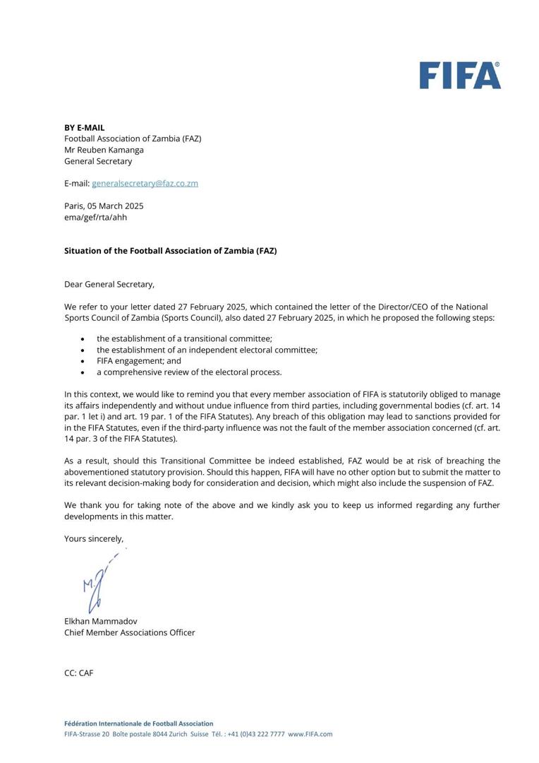 The threat followed after the National Sports Council of Zambia (NSCZ) had suggested the establishment of a transitional committee, an autonomous electoral committee, involvement of FIFA, and investigation into FAZ’s electoral process.