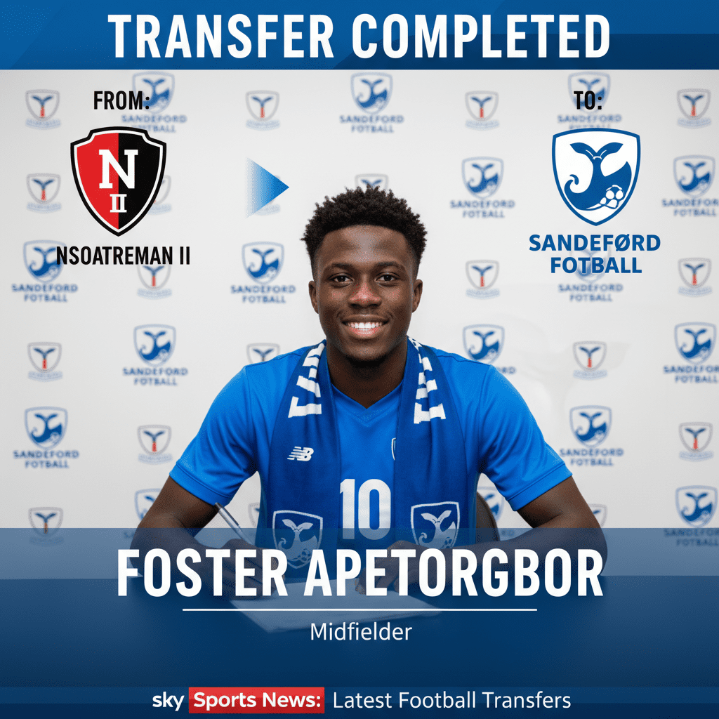 Foster Apetorgbor has completed a permanent move from Ghanaian side Nsoatreman FC II to Norwegian club Sandefjord Fotball in a deal that takes the teenager abroad to pursue his career in the Eliteserien. The transfer is officially confirmed, with his contract at Sandefjord beginning on 2026-03-11 and running until an undisclosed later end date.