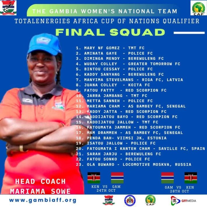 Gambia coach Mariama Bom Sowe has announced her final 23-player squad for the decisive Africa Women’s Cup of Nations qualifying matches against Kenya.