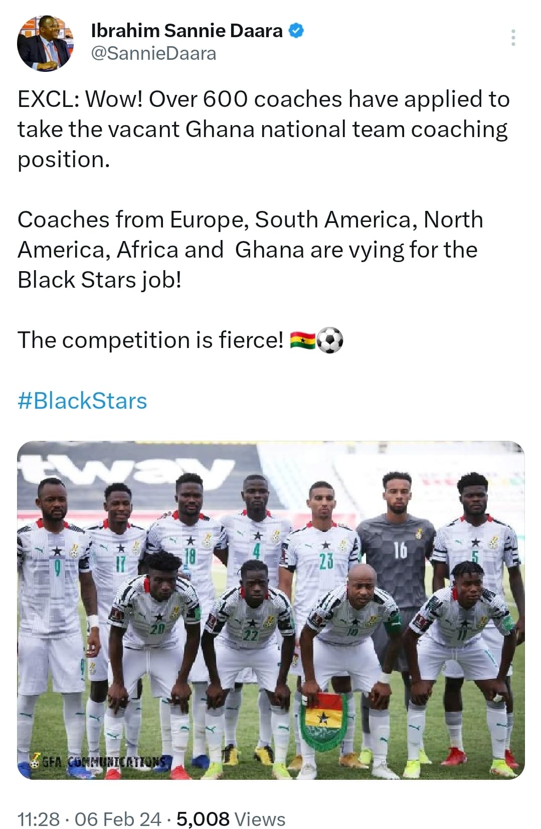 The Ghana Football Association (GFA) has received over 600 applications for the national team coach position following the dismissal of Chris Hughton after an embarrassing AFCON 2023 performance.
