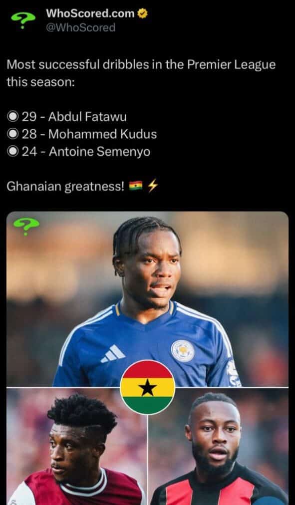 Joining Issahaku in showcasing exceptional dribbling abilities are two other Ghanaian internationals: Mohammed Kudus of West Ham United and Antoine Semenyo of AFC Bournemouth.