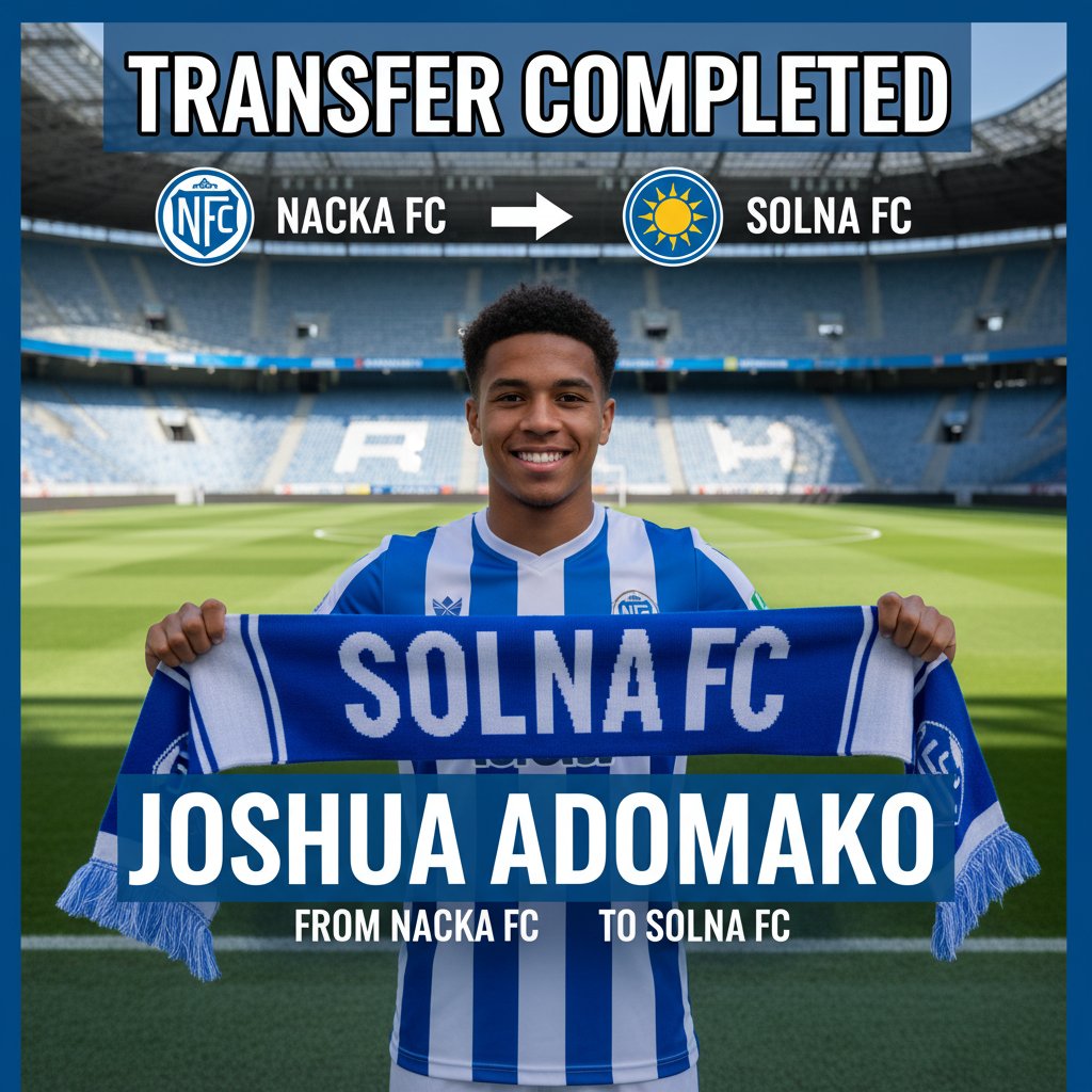 Joshua Adomako has completed a move to Solna FC from Nacka FC on a free transfer, with his new contract at the Solna-based club running from 2026-04-05 to 2027-06-30. The 33-year-old centre-back joins as a confirmed signing, ending his spell at Nacka FC and becoming the latest experienced defender added to Solna’s back line.