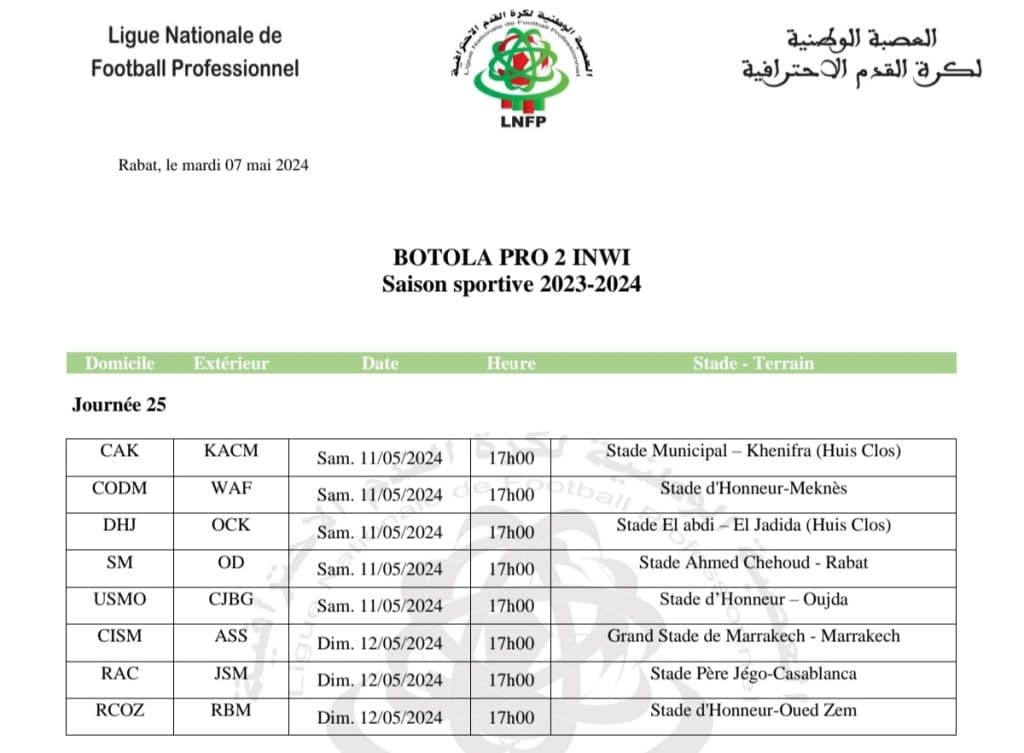 Moroccan professional league programs unified match schedule for round 25