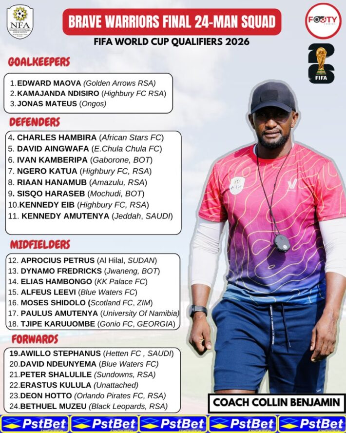 Namibia coach Colin Benjamin has named his final 24-man squad for the decisive October fixtures of the 2026 FIFA World Cup qualifiers.