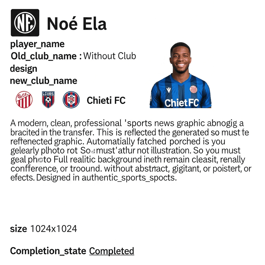 Noé Ela has completed a move to Italian side Chieti FC 1922, signing as a free agent after a short spell without a club. The 22-year-old centre-forward joins the Serie D – Girone F outfit from his unattached status following his departure from Deportivo Alavés C earlier in the same season. His contract with Chieti runs from 28/11/2025 to 30/06/2026.