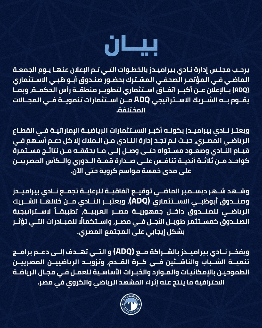 The board of directors of Pyramids FC issued a statement warmly welcoming the steps announced last Friday during the joint press conference attended by the Abu Dhabi Investment Fund (ADQ) regarding the largest investment agreement to develop the Ras El Hekma area, along with ADQ’s strategic investments in various fields.