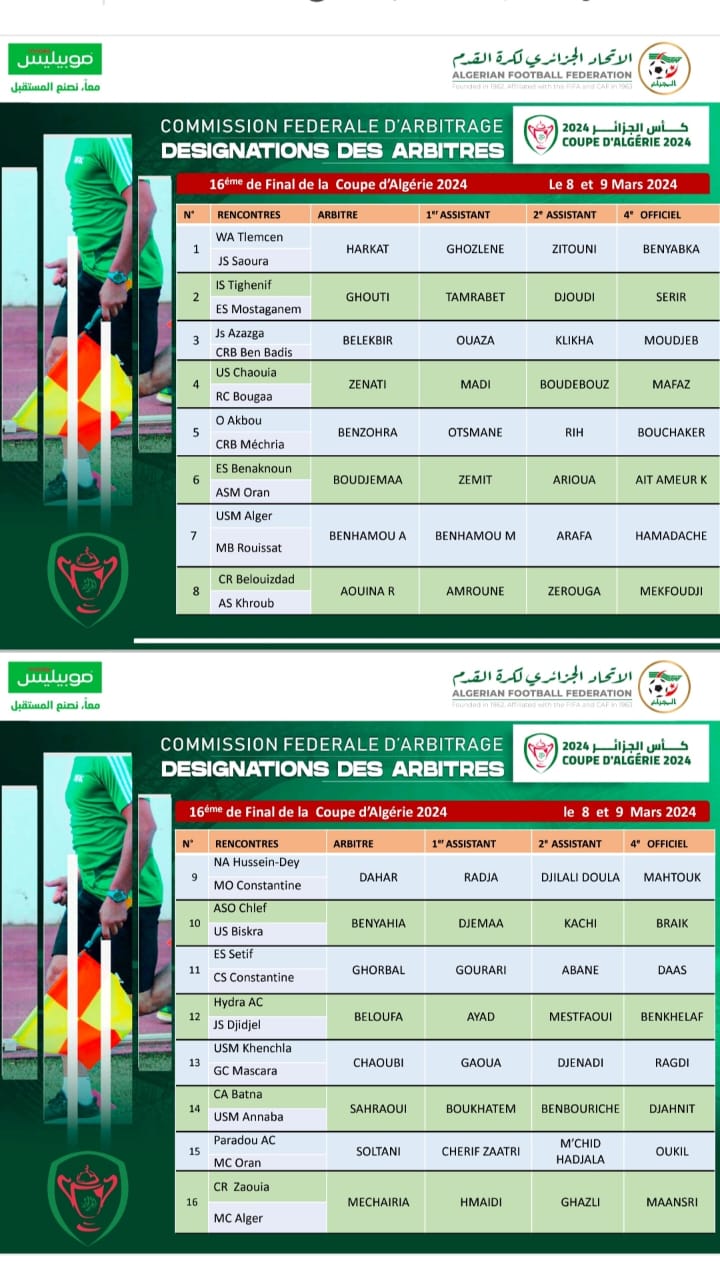 The referees appointed for the Round of 16 matches in the Algerian Cup are as follows: