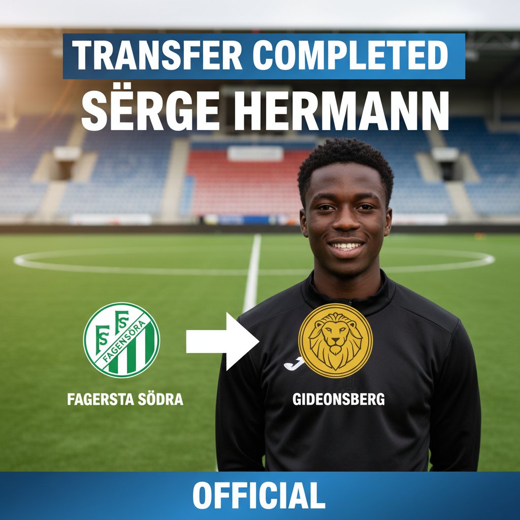Centre-forward Sèrge Hermann has completed a free transfer from Fagersta Södra to Gideonsberg, with his new contract running from 2026-04-06 to 2027-06-30.
