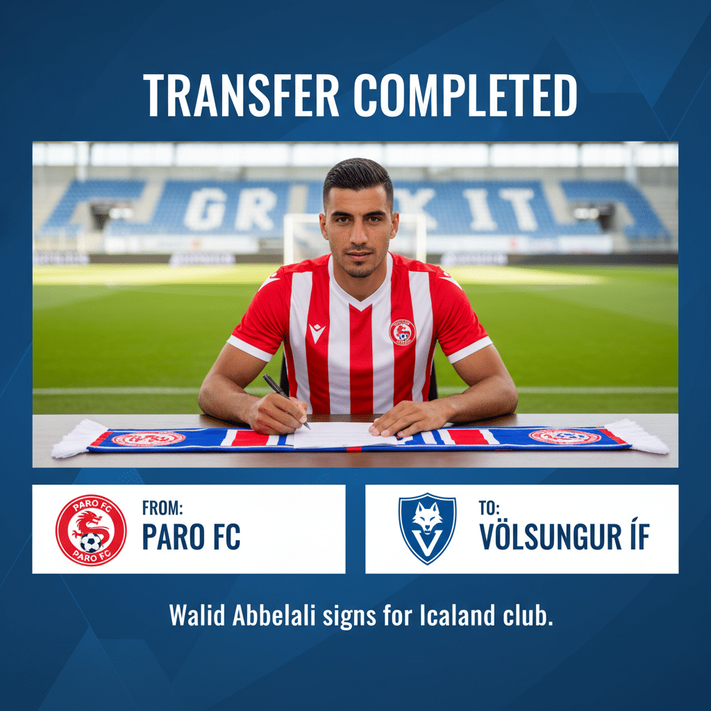 Walid Abdelali has completed a free transfer from Paro FC to Icelandic side Völsungur ÍF, sealing a move that takes the French-Algerian defensive midfielder from the Bhutan Premier League to the Lengjudeild. The 33-year-old joins the club on a deal running from 2026-04-17 to 2027-12-31, with the transfer officially registered as a free move and no market value listed for the player at the time of the switch.