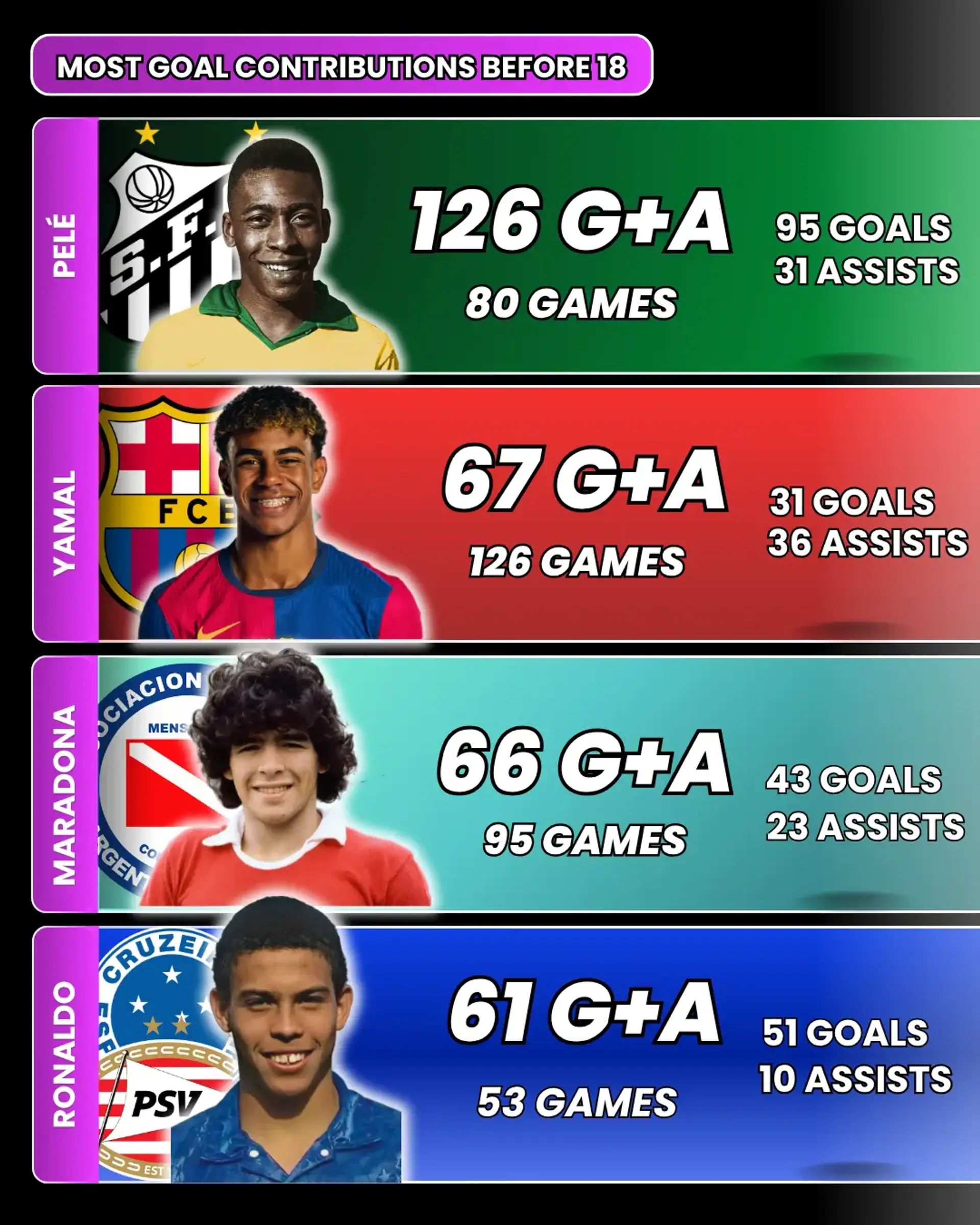 According to comparative data, Pelé remains unmatched in this category, recording 126 goal contributions (95 goals, 31 assists) in just 80 games as a teenager.