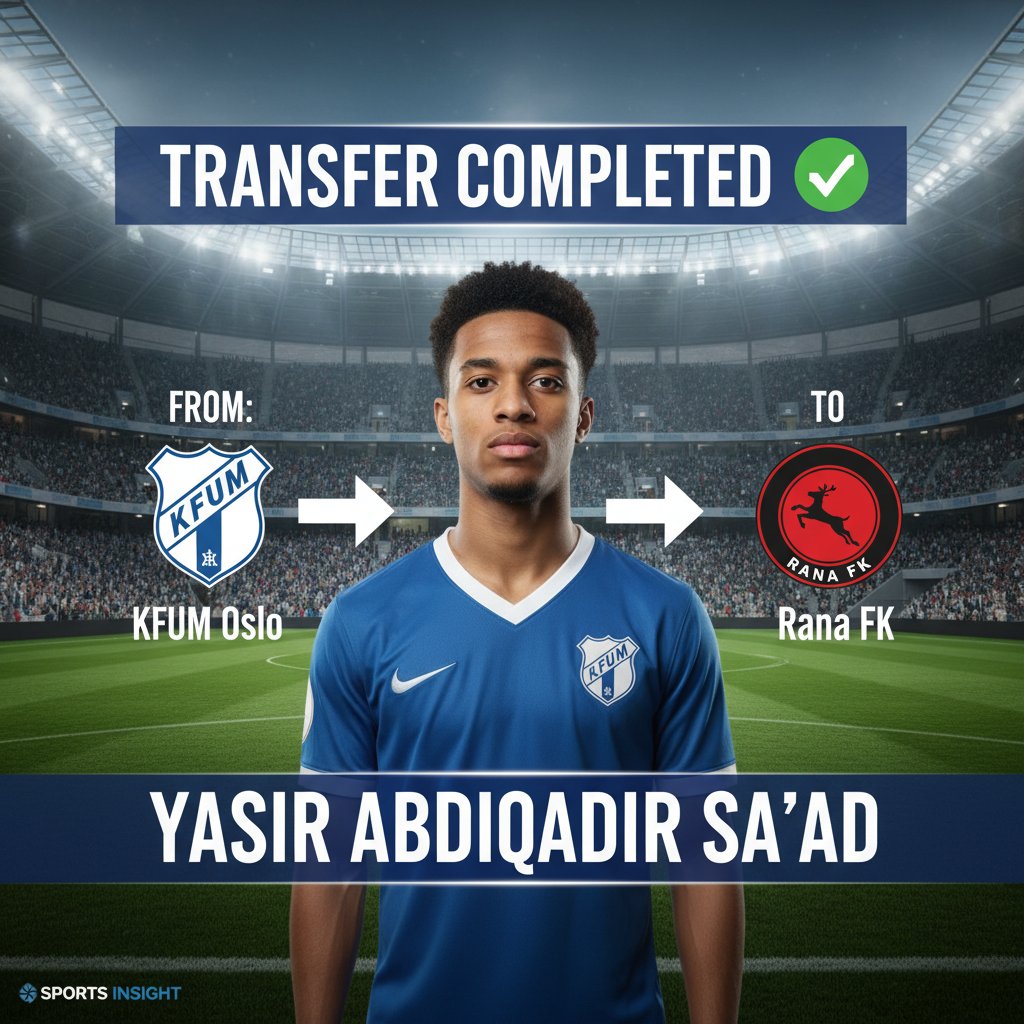 Somalia–Norway right winger Yasir Abdiqadir Sa’Ad has completed a permanent move from KFUM Oslo to Rana FK on a free transfer, signing a contract that begins on 2026-03-31 and is currently scheduled to run until an unspecified future date, with no expiry listed in the available registration data.