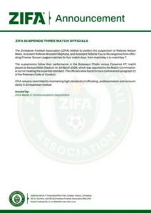 The Zimbabwe Football Association has suspended three match officials following concerns raised over their performance in a Premier Soccer League fixture between Bulawayo Chiefs and Dynamos FC.